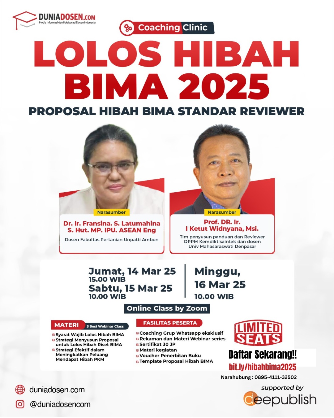 Duniadosen.com mempersembahkan “Coaching Clinic Lolos Hibah BIMA 2025: Proposal Hibah BIMA Standar Reviewer”. Mari bedah proposal hibah bersama 2 dosen reviewer sekaligus.